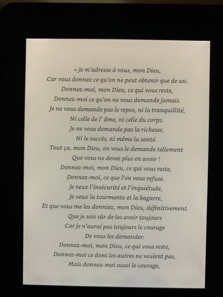 J’ai aussi beaucoup aimé durant un des moments forts du roman, cette prière mise par l’auteur du parachutiste, André Zirnheld de 1938 :