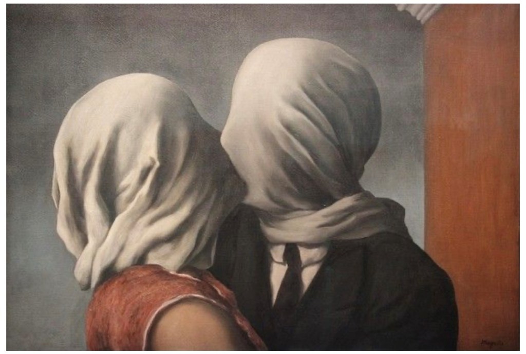 Il s’agit de deux visages moulés dans des linges et qui s’embrassent. Magritte nous propose une nouvelle appréhension du réel : ses images deviennent quasiment des mots et portent des pensées quasi philosophiques. Un style toujours méticuleux. Les voiles anodins qui couvrent la tête de ces sujets ont été rapportés au pan de robe qui recouvrait le visage de la mère de Magritte, Regina, lorsqu’on la sortit de Sambre où elle s’était jetée…. (Source « Aufildejb »).